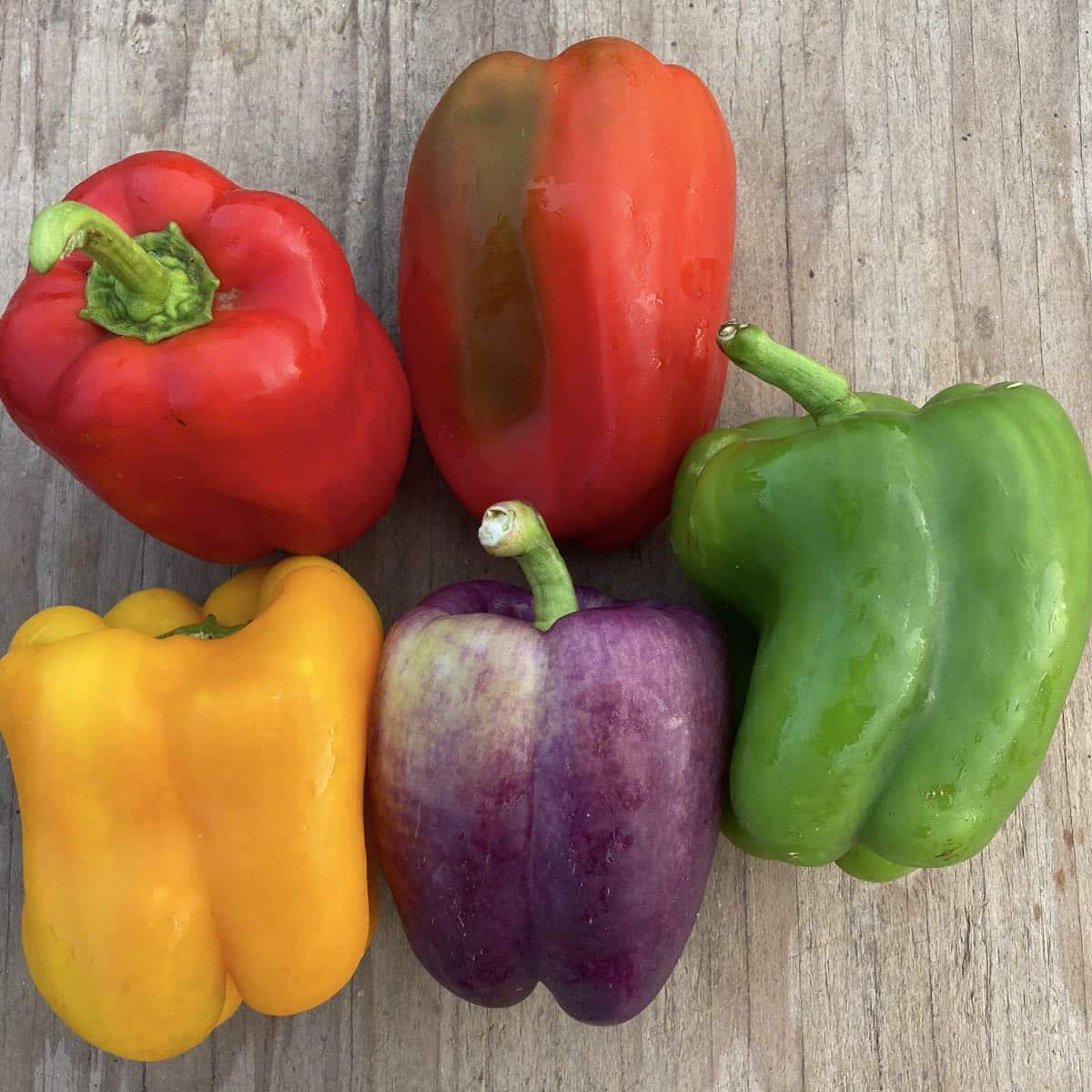 Bell peppers (sweet) are blocky and thick-walled, great for salads, stuffing, grilling, and roasting, where their thick walls are an advantage. This week’s bell peppers are red or yellow, but we grow red, yellow, orange, purple and green bell peppers.