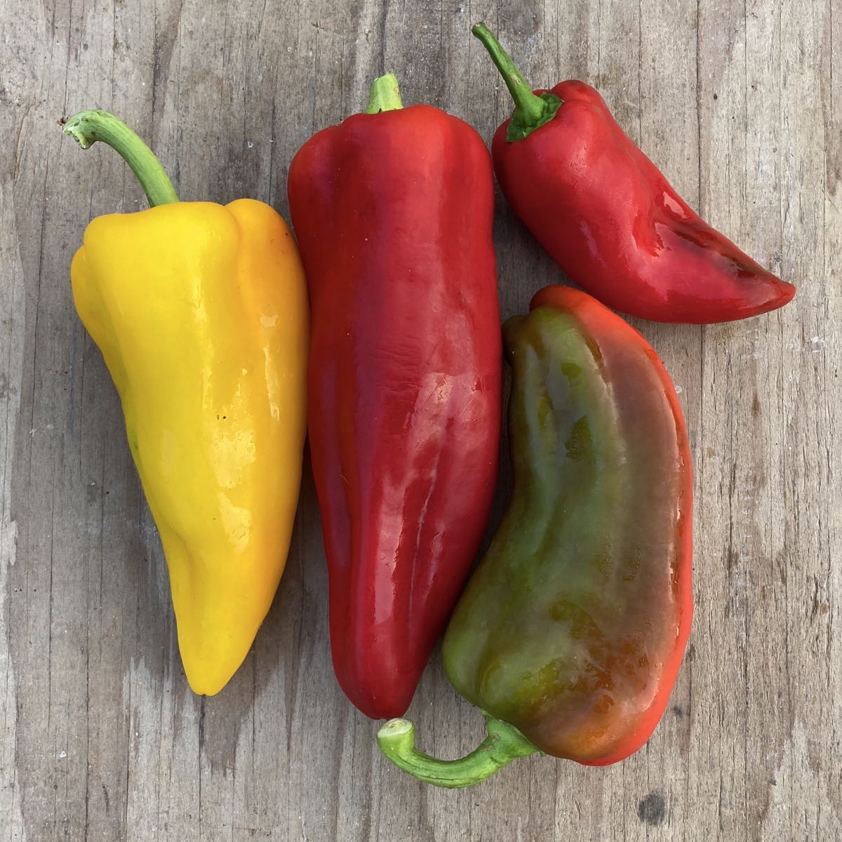 Frying peppers (sweet) are thinner walled, with a pointed tip. This type is great for frying. They have lower moisture, which allows them to fry and brown in hot oil. Frying peppers can also be stuffed or used for salads. They are less useful for roasting, because of their thinner walls, and lower yield after roasting. We grow red, yellow and green frying peppers.